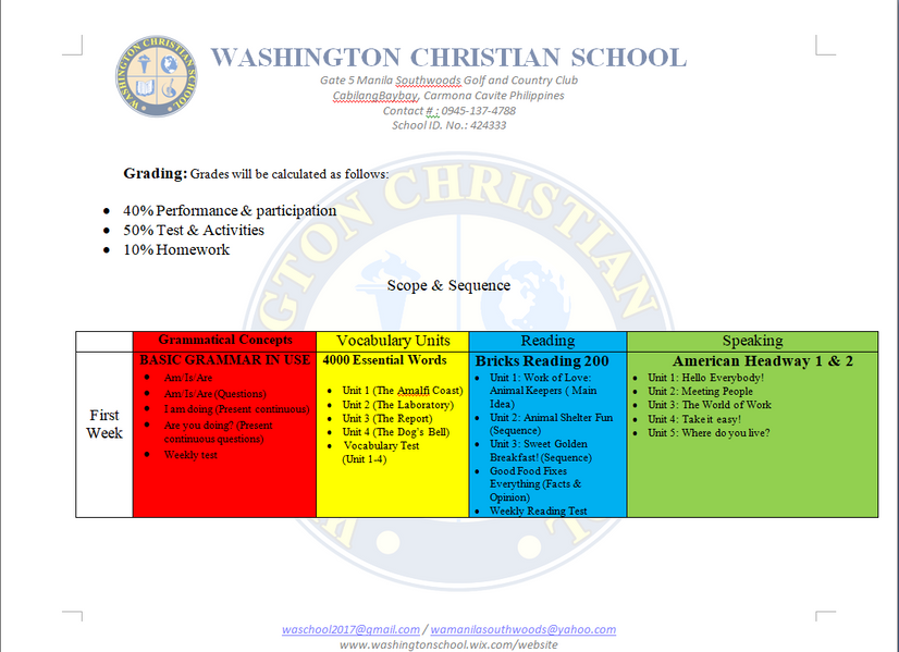 Specific units are described in the scope and sequence on the following pages. Every unit will develop students’ Listening, Speaking, Reading, and Writing skills: